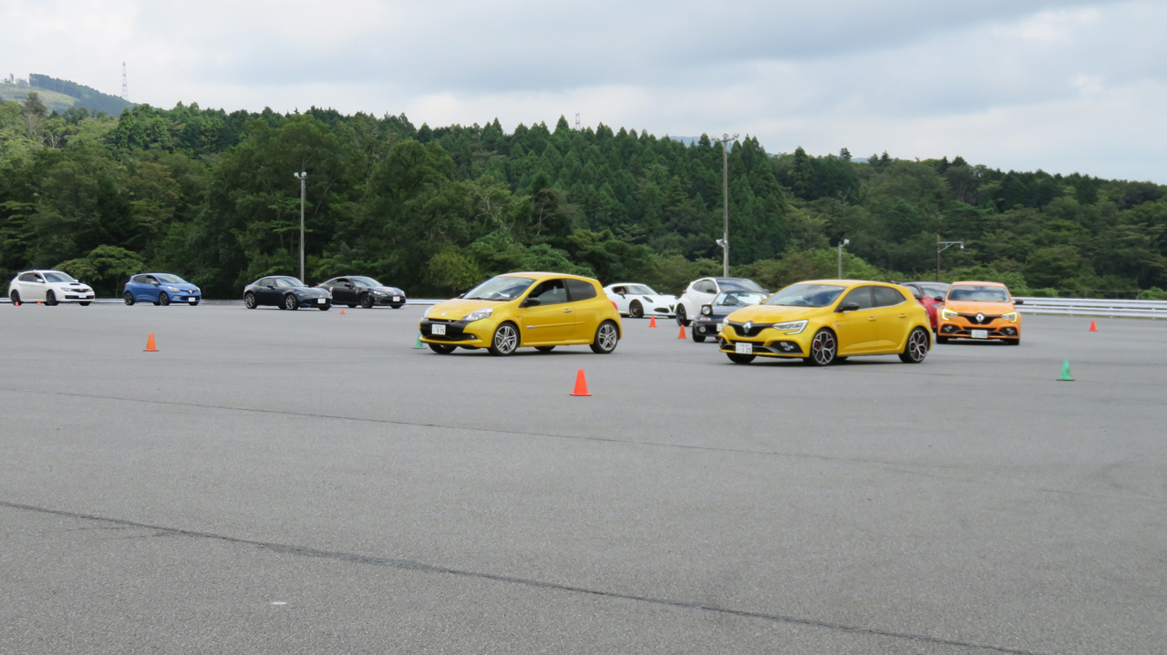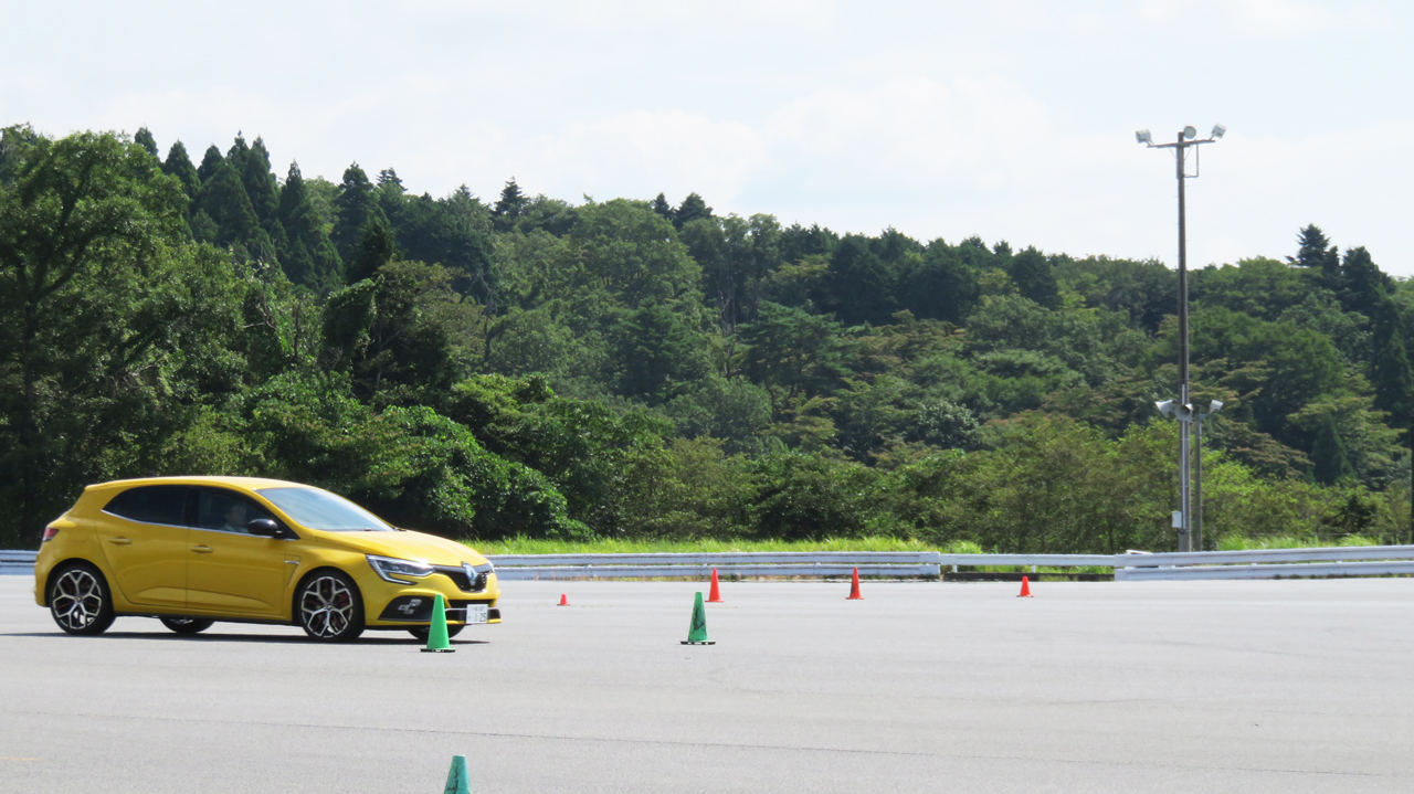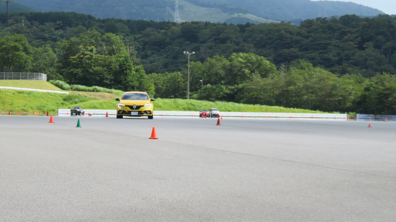 今回唯一のルノー乗りのEさんがビッグブレーキに挑戦します。100キロプラスからできるだけ短い距離でクルマを静止させる練習。ブレーキペダルの踏み方で制動距離が大幅に異なることを体験します。