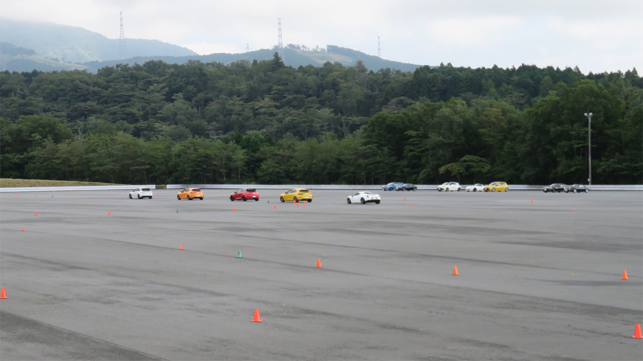 Eさんが20m間隔においたコーンのスラロームコースを駆け抜けます。クルマは連続した切り返しが苦手です。切り返しを連続するのではなく一瞬がフラットな状態をはさんでやることでクルマが走りやすい状況を作ります。