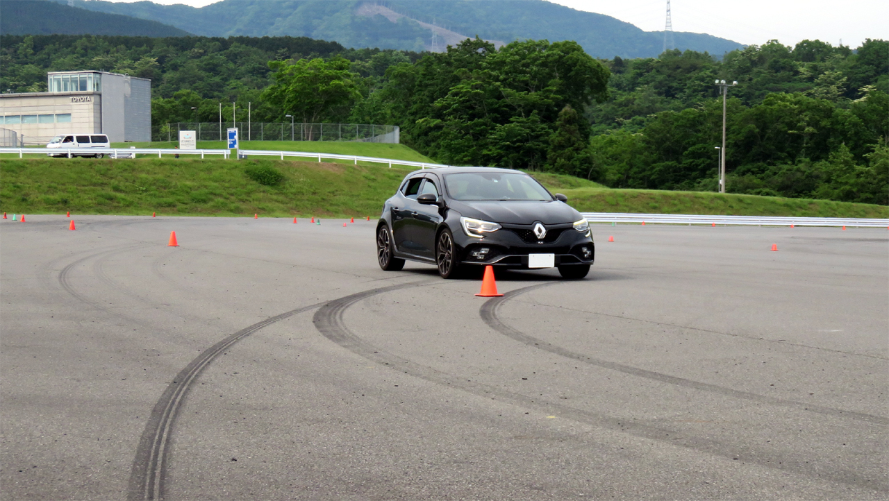 タイヤのグリップ力を最大限に引き出すコーナリング方法を教えていただきました。今まではフロントタイヤの荷重を中心にコーナリングを考えていたのですが、後輪も上手に使うことによってより安定して速く走れるようになると。これは後輪の操舵機能を持つメガーヌⅣRSでは後輪を上手く使うことによって、より早く車の向きを変えられることに繋がるかもしれないと感じました。