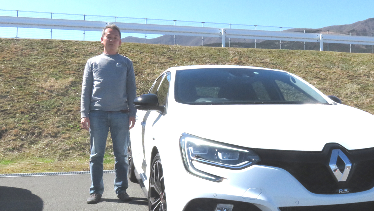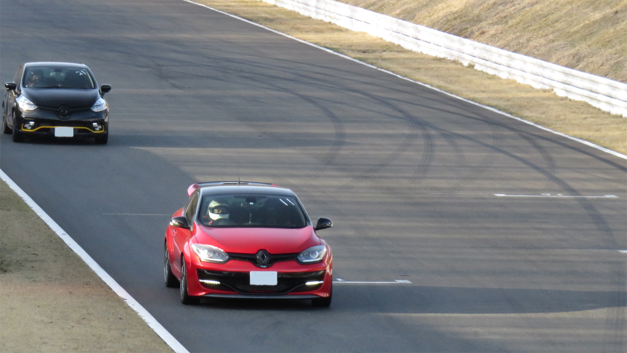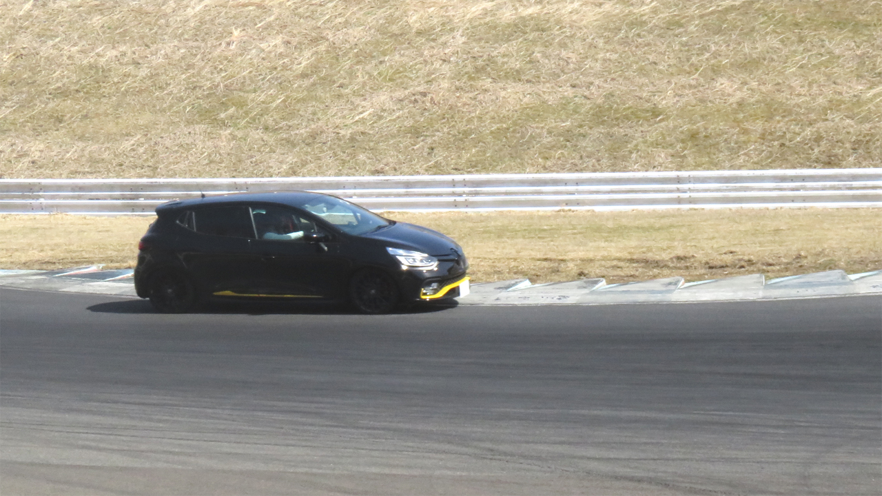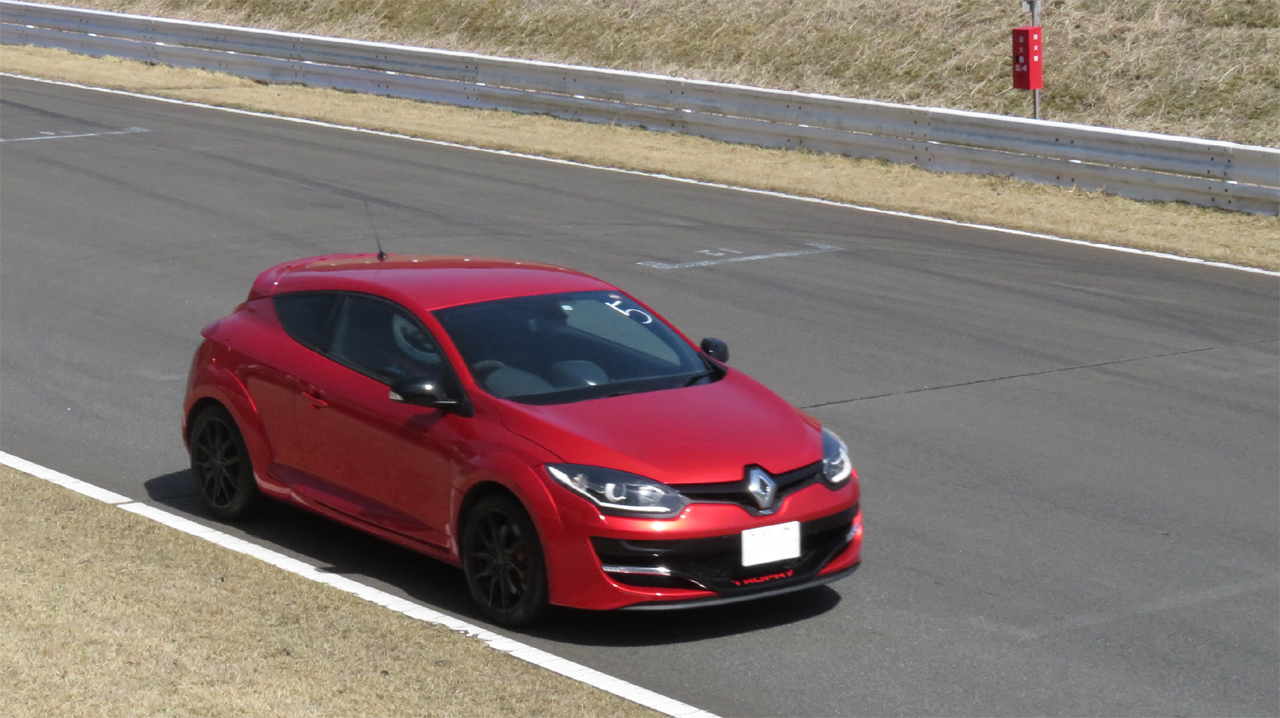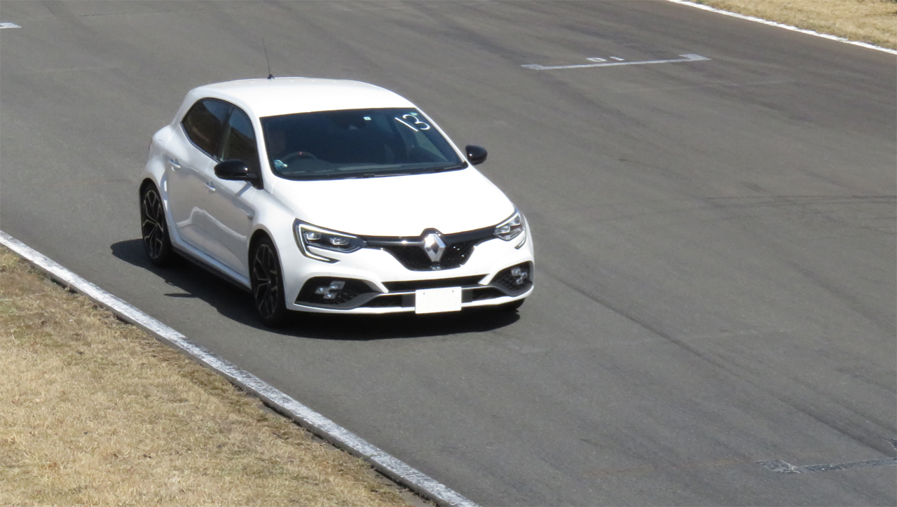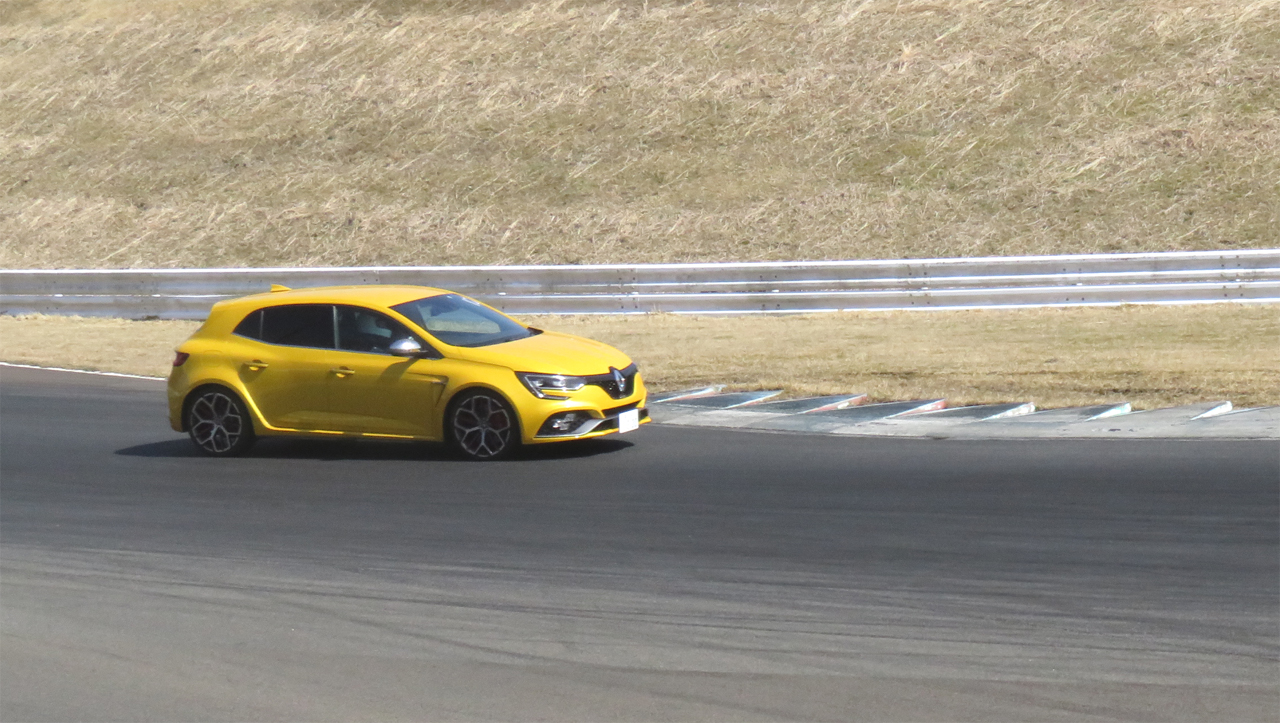 スタッフが同乗走行中のHのメガーヌRSが最終コーナーを立ち上がる