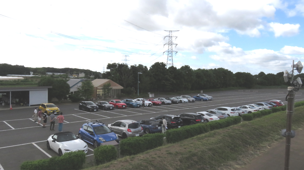 駐車場の両側にお互いが見えるようにクルマを停めてもらって参加者はクルマの中