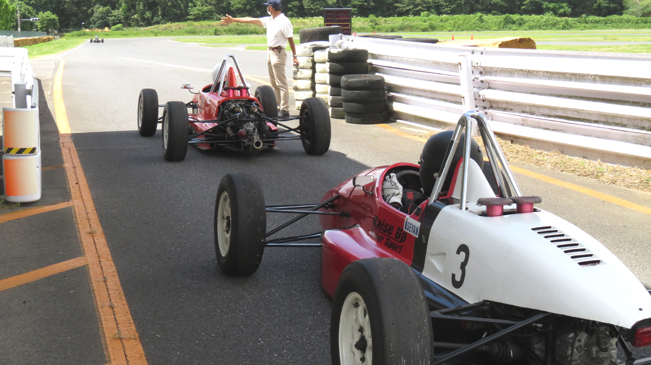 それでも、コースを一周する頃には、恐ろしくクイックな運転感覚に夢中になっていました。手首を5ミリか1センチか動かすだけでノーズは瞬時に向きを変えます。乗用車ならリアが動き出すまで一瞬の「タメ」を待つ必要があるけれど、フォーミュラカーはフロントが動き始めると瞬時にリアタイヤにもスリップアングルが発生する感じ。最終コーナーを注意深く立ち上がり、横方向の動きが消えたのを確認してフルスロットに。30年以上前のスバル製のエンジンは軽い車体を気持ちよく加速させてゆきます。指定された5500回転を前に、5300回転で4速にシフトアップ。身体に風が当たるのが気持ちいい。ブレーキング。アシストがなくてブレーキは重いけど、分かりやすく調整しやすい。ブレーキを抜きながら、操作を重ねる量に気を付けながら、少しずつステアリングを動かし始めると素直に向きを変えてくれます。ものすごく運転しやすい…と思い始めました。