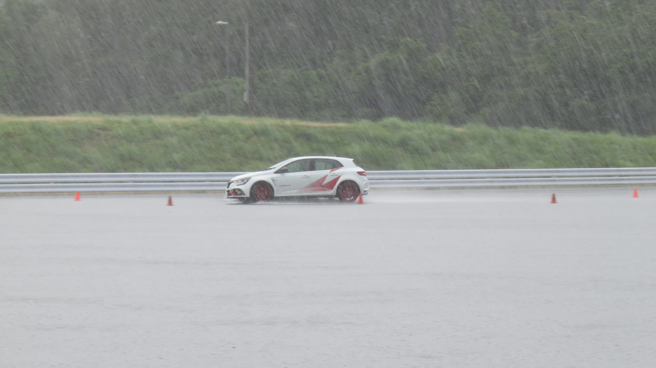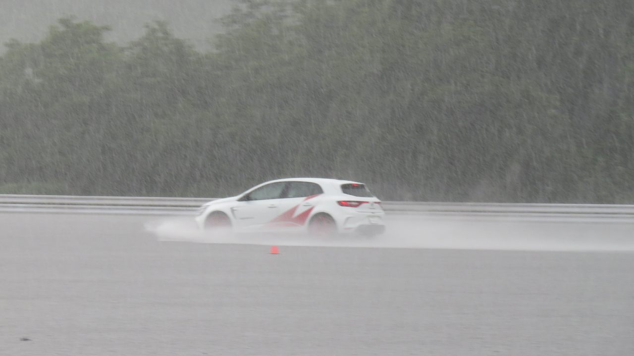 最後に「Neutral」モード。これにはびっくりです。電子デバイスが全てを上手に制御してくれました。ターンインの初めにアンダーステアさえを出さなければ、水深1㎝のような最悪のコンディションの中をまるで線路が敷かれているように何事もなく相当の速さで走ってくれます。思わず「何だこりゃ!スゲーー!」と大笑いしてしまいました!コーナーリング中はどこの車輪をどのように制御しているのか分からないほど細かく細かくコントロールしているのでしょう。アクセルを踏めば踏んだだけ前に出ますし、それでいてグイグイ曲がってくれます。立ち上がりでアクセル開度を大きくするとホイールスピンを最小限に抑えつつ加速してくれました。あの路面コンディションでは考えられないほど高次元で走ってくれました。「メガーヌすげー!」「トロフィーすげー!」です。ウルゴンがドライブしても、私がドライブしてもおそらく差が無いくらい本当によく出来ていると感心させられました。このモードが私には一番印象深く、メガーヌ買っちゃうかな!?とちょっと思ってしまいました。