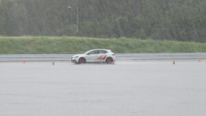 試乗した頃に雨が降ってきまして、急に激しく降られました。昨今ではゲリラ豪雨と表現した方が分かりやすいでしょうか、相当の雨量です。駐車場のため全域ほぼフラットなので1cmくらい雨が溜まっているような状態での試乗でした。この車には多くのレーシングドライバーやジャーナリストの方が乗ったでしょうが、おそらくこれだけの激しいレインコンディションで試乗したドライバーはいないと思いますので、大変貴重な経験になったと思います。