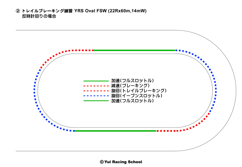 次に小さなオーバルをインベタで走ってトレイルブレーキングの練習をします