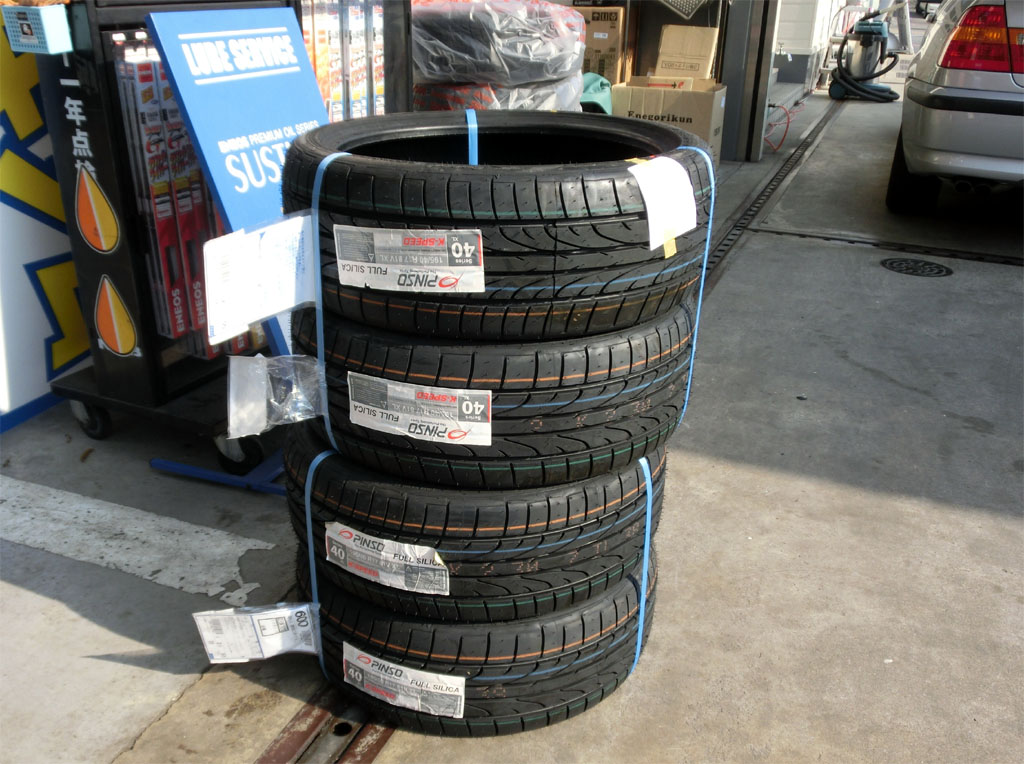 結局、いわゆるハイグリップタイヤと呼ばれるものには興味はないが、トレッドエッジが立っているタイヤが好みなので、ある通販サイトで見つけたインドネシアで作られているPINSOのKスピードというタイヤにした。価格は1本5,290円。これに1本1,050円の送料が加わりタイヤ代は25,360円。