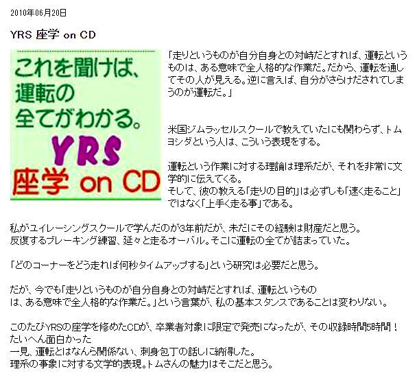 ぜひYRS CDを聞いてみて下さい。ユイレーシングスクールの座学とスクールでのアドバイスを集約して収録した音声CDです。実際にスクールを受講しなくても、ご自身のクルマを題材に自習できるような内容になっています。録音時間5時間半のCDはクルマの運転を間違いなく次のステップに導きます。
