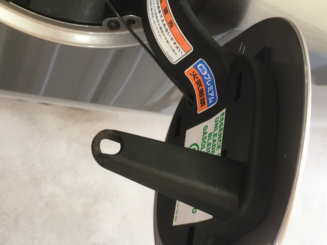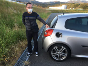 聞けばFSWに来る途中でガソリンを入れようとしたら給油口の蓋が開かなかったとらしい。あーでもないこーでもないをやっているうちに、レースに参加していたAさんがパカッと。リアのショックアブソーバー近くにある点検口に手を突っ込んで探っていたら可動部分があったので引いてみたとのこと。Aさん大手柄。