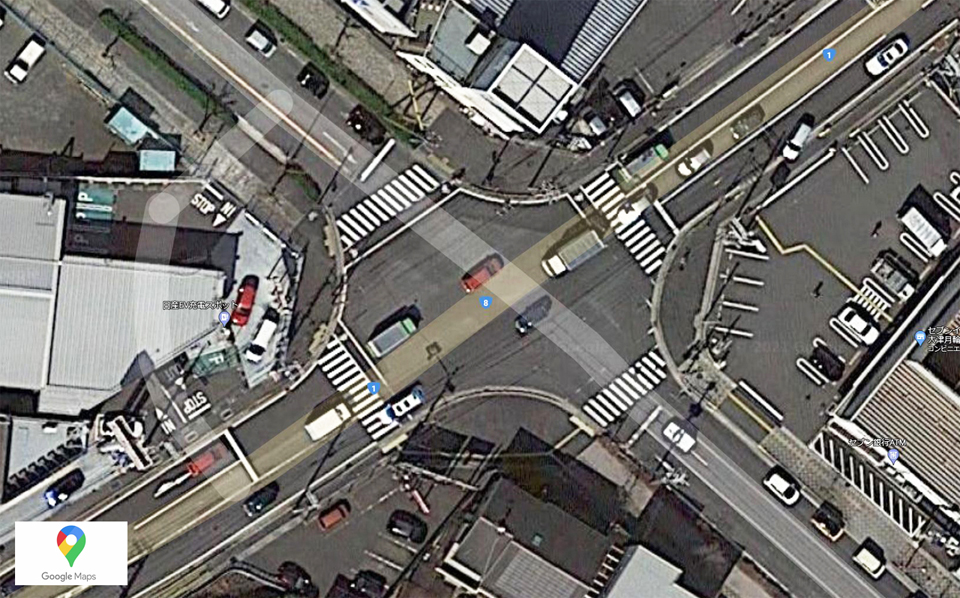 これは私見だし歩行者からブーイングがくるかも知れないけど、横断歩道の位置を左折したクルマが2台くらい止まれるくらい交差点から離れたところに移動するのもありだと思う。交差点の渡り方によっては歩行者が歩く距離が増えるかもしれないけど、歩行者優先と刷り込まれているからか、歩行者が歩いていると横断歩道との距離を開けてクルマを止め、後続のクルマが直進できずに次のサイクルまで待たなければならない例は枚挙にいとまがない。
