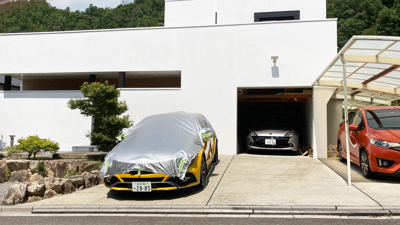 ルーテシアRSを借りていた時に追加したカーポートには残念ながら、幅の広いメガーヌRSトロフィーは収まらない。かわいそうだけどこんな姿で暑さをしのいでもらっている。室内の熱気を逃がすために4枚のドアウインドを少しずつ開けて。