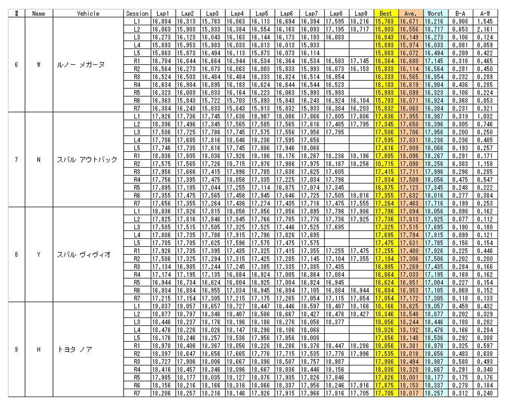 ユイレーシングスクールではYRSオーバルスクールに参加してくれた方が記録したラップタイムを表にして送っている。計測した全てのラップタイム、ベストラップタイム、アベレージラップタイム、ワーストラップタイムをはじき出してある。さらに、ベストとアベレージの差、アベレージとワーストの差も計算してある。どんな表なのかは下の画像を見てほしいのだが、セッションの欄にあるRは右回り、Lは左回りを示している。