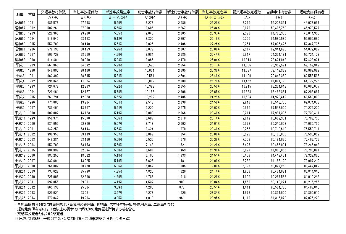 しかも、いったん単独事故が起こすと死にいたる可能性が高い、ということを、クルマを運転する人全てが意識しておいたほうがいいと思う。いささか暗澹たる気持ちでデータを更新するたび、厳に自分も戒めることにしている。