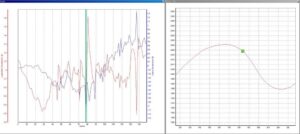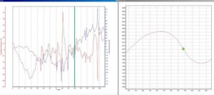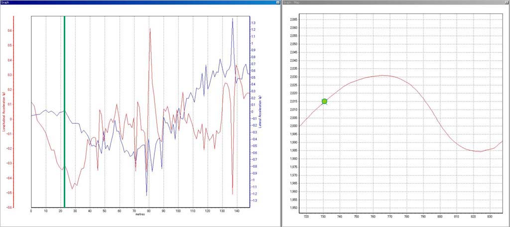 見難いかもしれないが、図は左の座標が加減速Gで赤い折れ線グラフで増減を、右の座標は横Gで青い折れ線グラフで表示している。軌跡上の緑の丸がクルマの位置、グラフの中にある緑の縦線が対応するクルマの加速度を示している。ちなみにグラフでは、加減速Gがゼロを基点に最大0.7Gとマイナス0.6G、横Gは同じくプラスマイナス1.4Gを表示している。