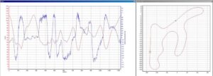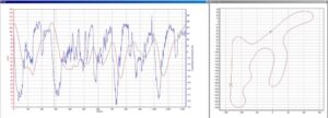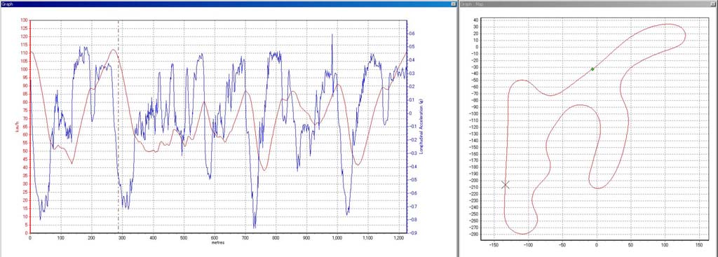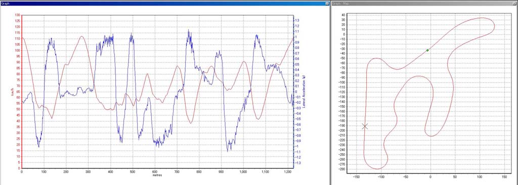 速度と加/減速度のグラフ。軌跡上の緑色の点がスタートライン。