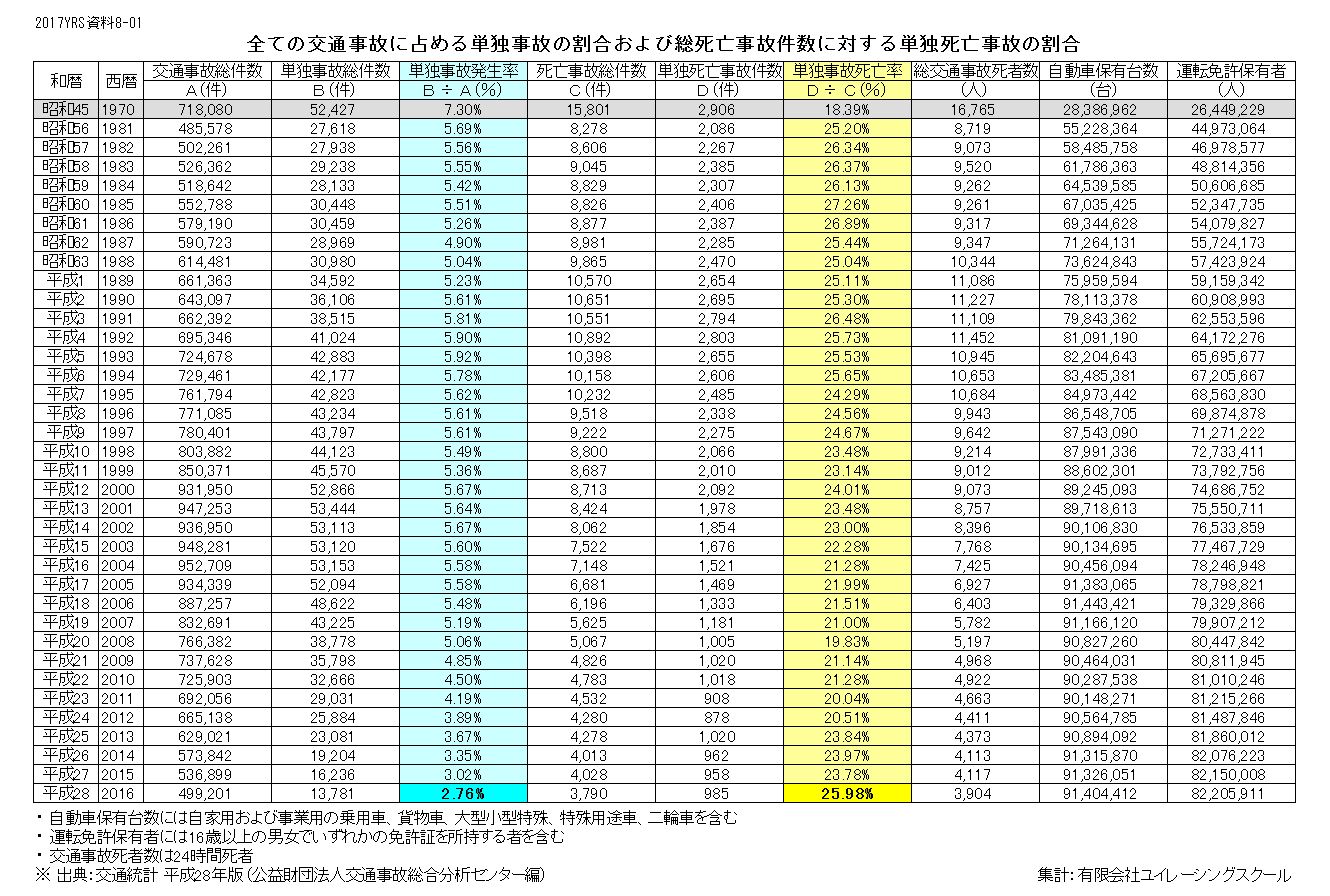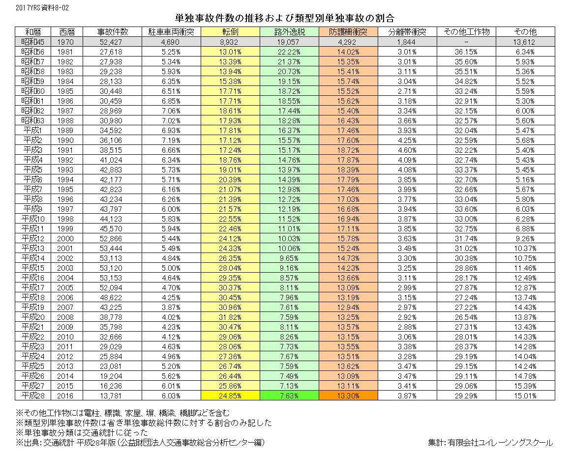 表を見てもらえばおわかりいただけると思うが、近年、交通事故件数、単独交通事故件数、死亡事故件数、交通事故死者数が減少傾向にあるのに、交通死亡事故件数に対する単独交通事故件数の割り合いは増加、もしくは高止まりという。