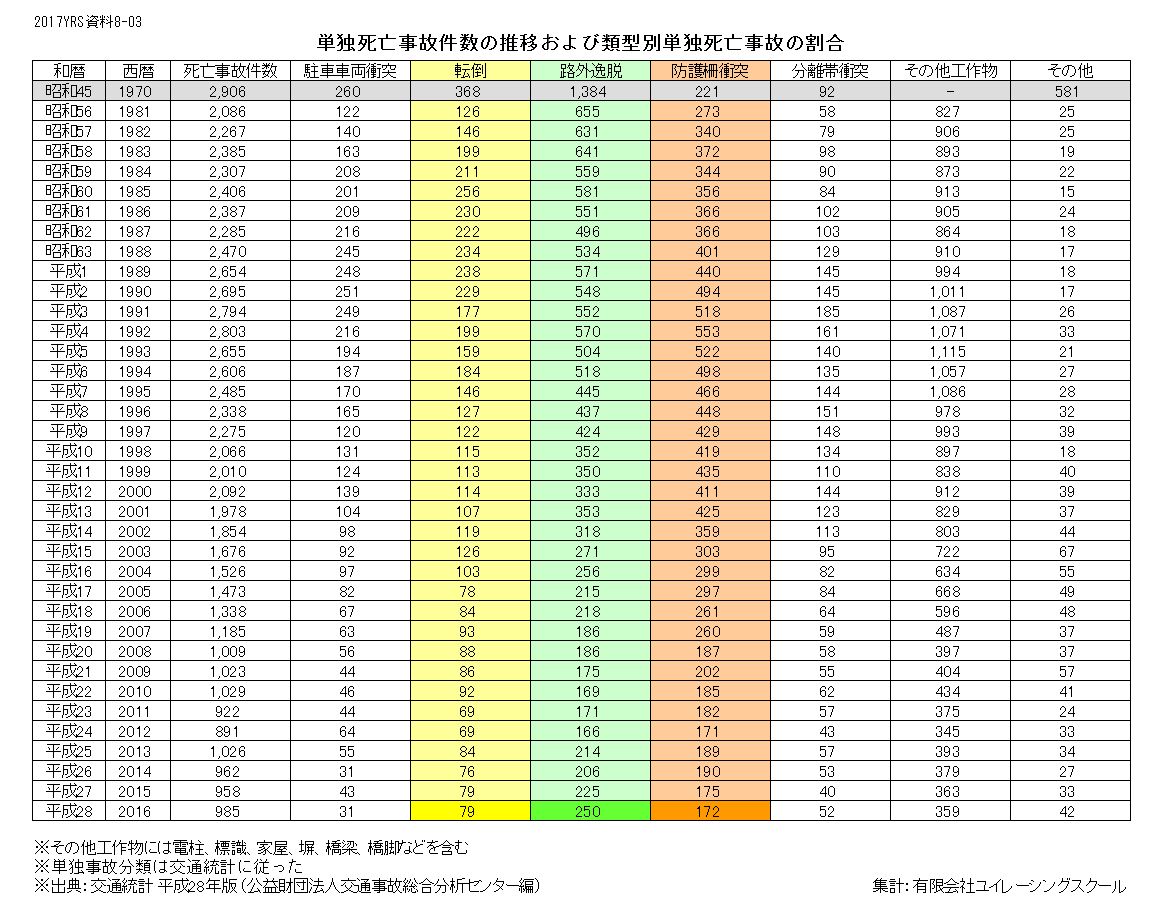 ここでは単独事故がなぜ起きるかというメカニズムを解明するつもりはない。ただ。2輪を含め自動車が高性能になってきた近年、自動車を動かす時にはいっそうの注意が必要だろう。何かあった時の速度、イコール慣性力は思いの他高いかも知れない。安全運転技術が発達してもそれらが人間にとって代わってくれるわけではなく、人間が操っている以上機械への依存度を高めることは「隙」を作ることになりかねず、引き続き運転する時の意識を高く保つ努力が必要だろう。集計をしながらそんなことを考える。