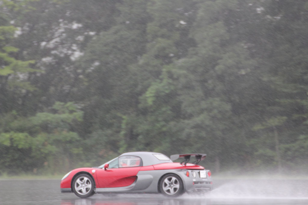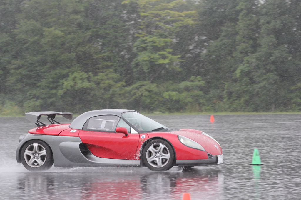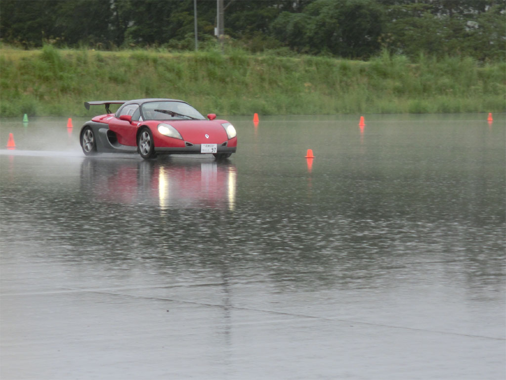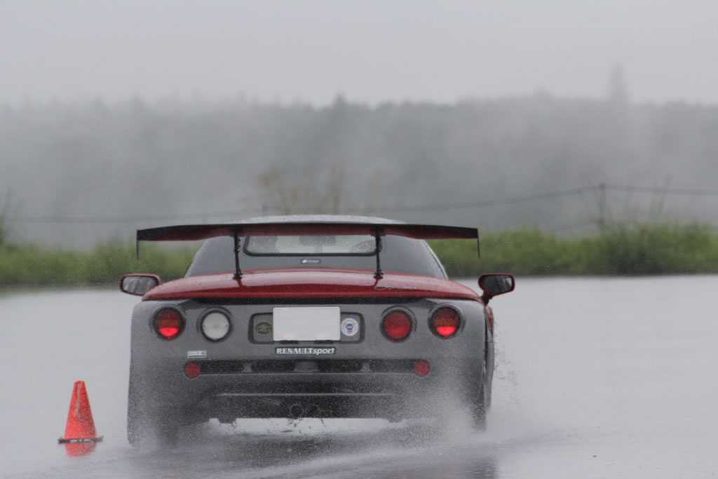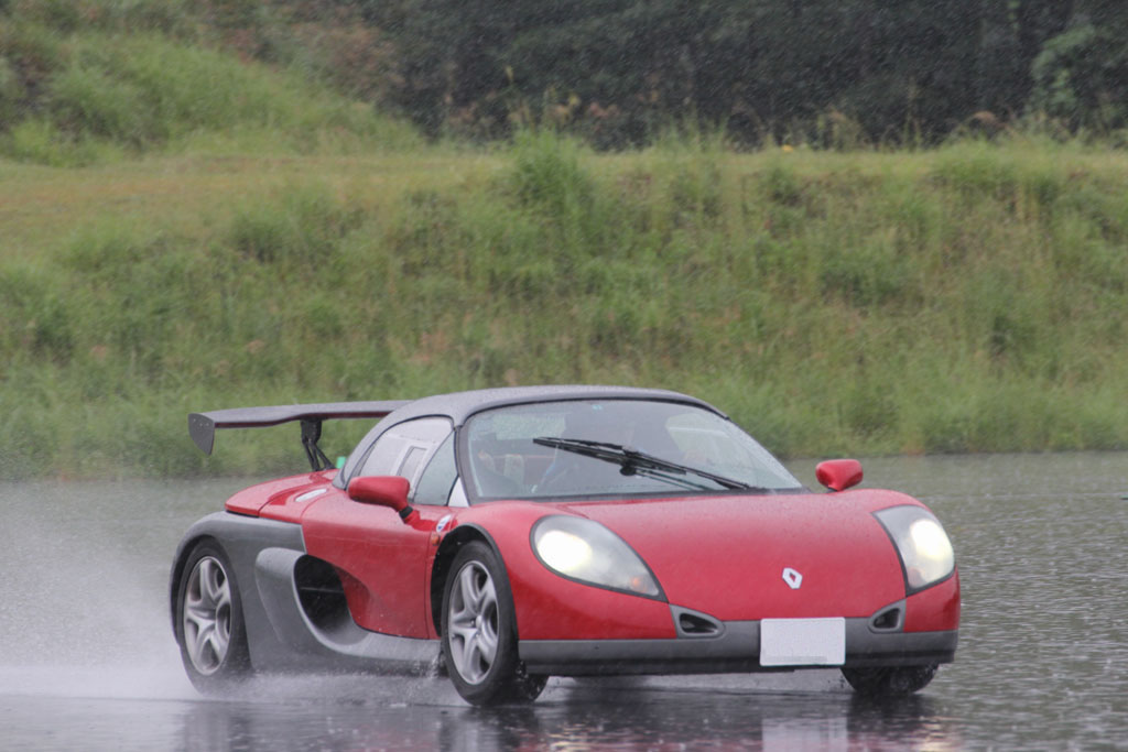 ユイレーシングスクールのスタッフの森田さんが新しいおもちゃを買った。乗ってみたかったので、無理を言って雨の中をYRSオーバルスクールに来てもらった。ホントはドライコンディションで乗りたかった、と言うと申し訳ないのだけれども、それでもルノー・スポールが市販したレーシングカーライクのスピダーの実力を垣間見ることはできた。森田さんに感謝。