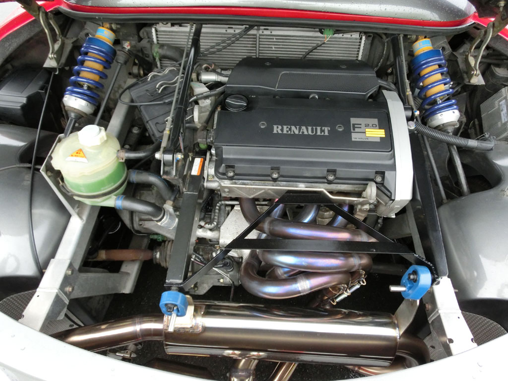 アフターマーケット品なのかタコ足が魅力的なエンジンベイ。左右にプッシュロッド入力を受けるコイルユニットとドライバーが背中に背負うであろうラジエターが見える