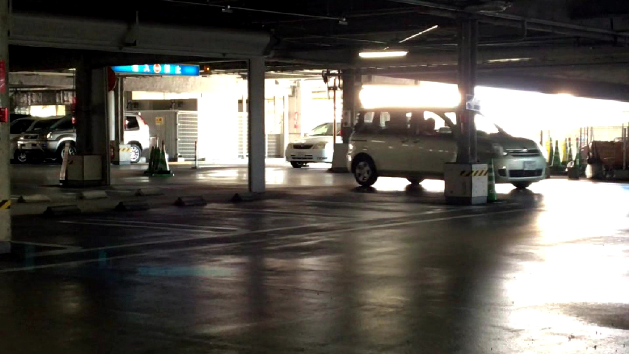 とあるスーパーマーケットの立体駐車場。スロープを登ってきたクルマは場内に入ると直後に左折。その後それぞれに広大な駐車スペースと進む。