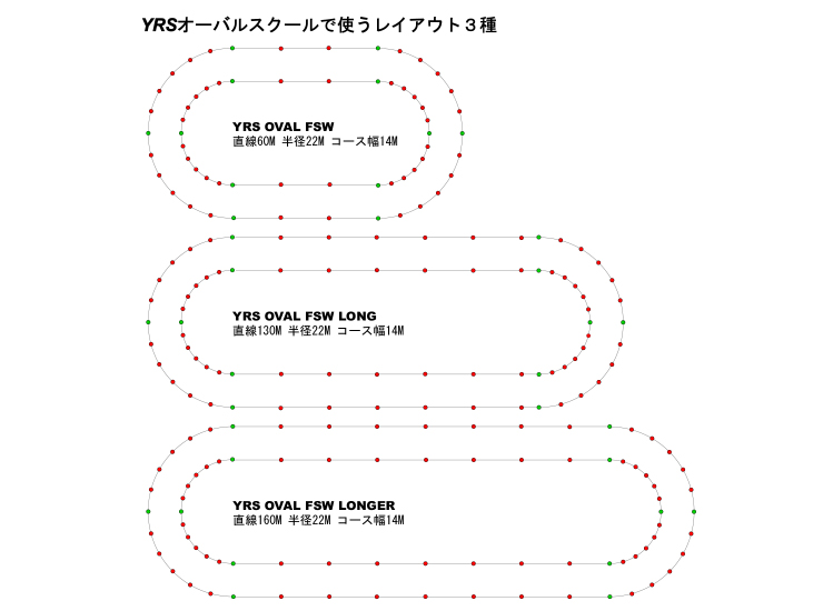 楕円形以外のコースもあるけれど、YRSオーバルスクールで使うコースは3つ。半径はどれも同じ22mで、直線の長さだけが違う。