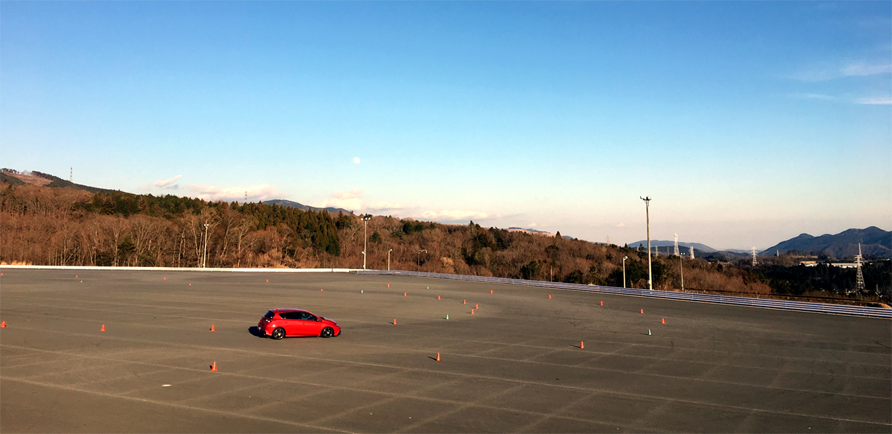 ユイレーシングスクールは広い駐車場にパイロンを並べて作ったコースで様々なドライビングスクールを開催している。