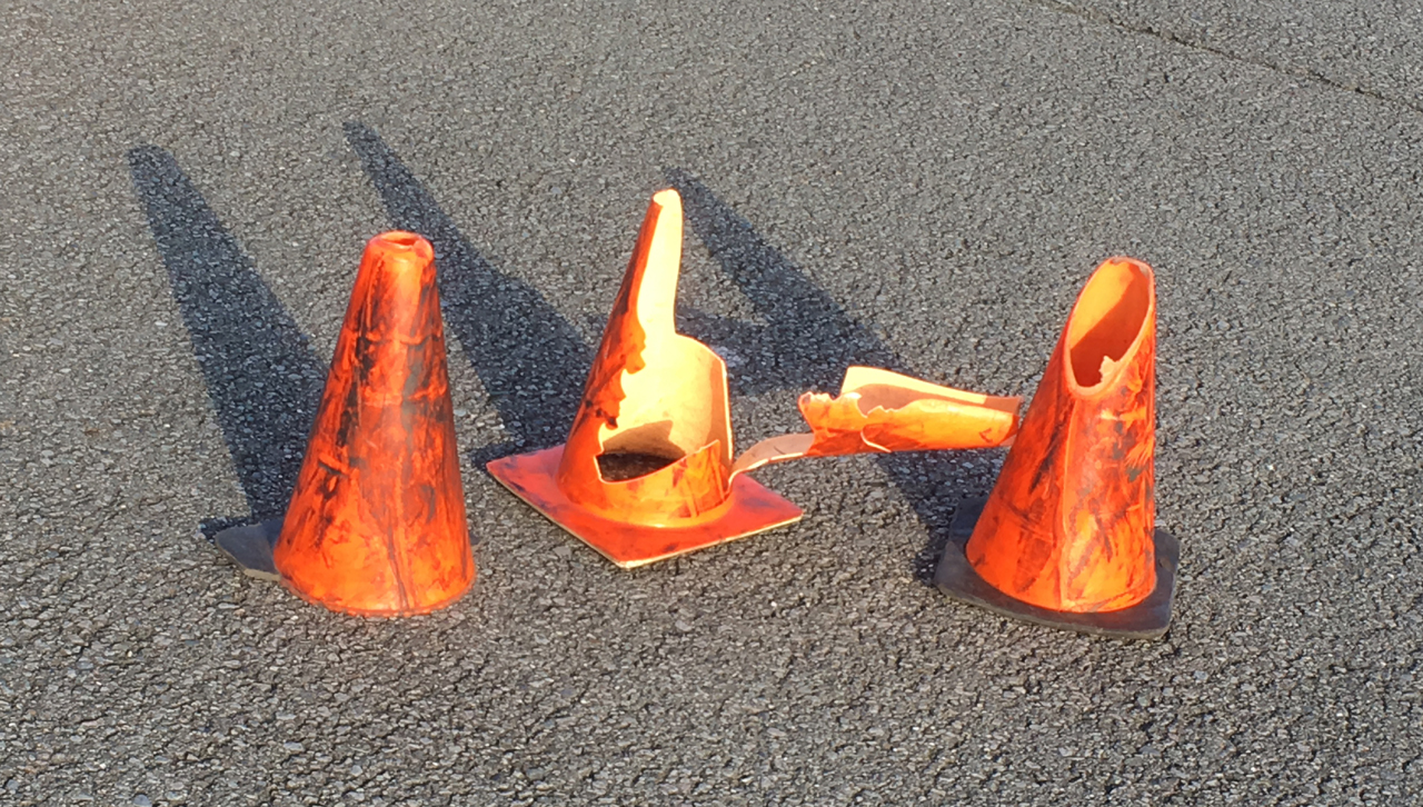パイロン自体はアメリカ製の柔らかいものを使っているからクルマに傷がつく心配はないのだが、特にインベタの走行では入り口の緑のパイロンから数えて2本目の赤いパイロンが犠牲になりやすい。パイロンを見ながら走っているので、まず前輪でパイロンを蹴飛ばすことはない。コーナーに対して内側の後輪で踏んづけたり蹴飛ばしたり巻き込んだりする。