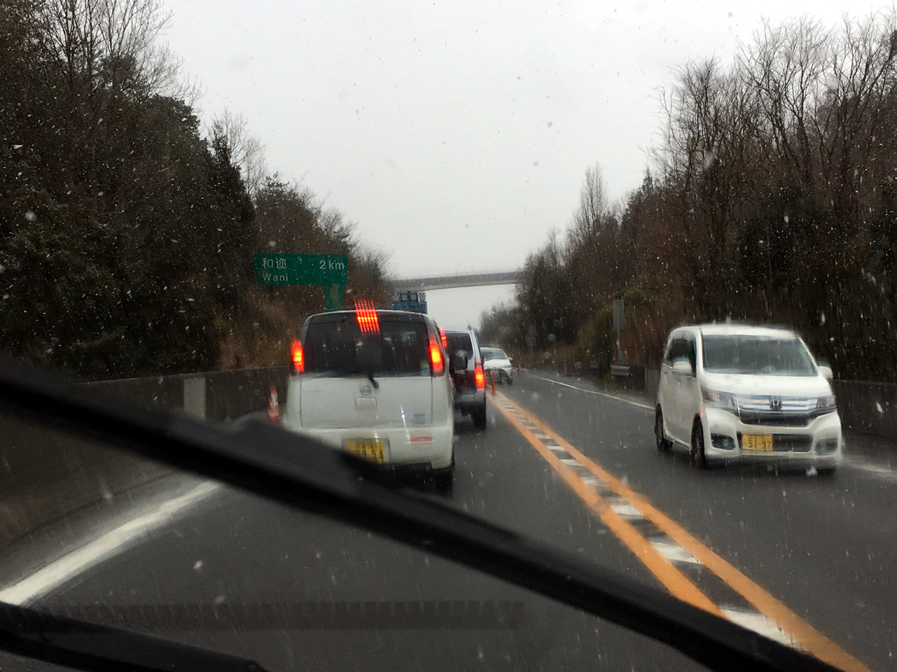 雪のちらつく朝。湖西道路で工事のための片側交互通行。南行きがストップランプを点けて並んでいる。