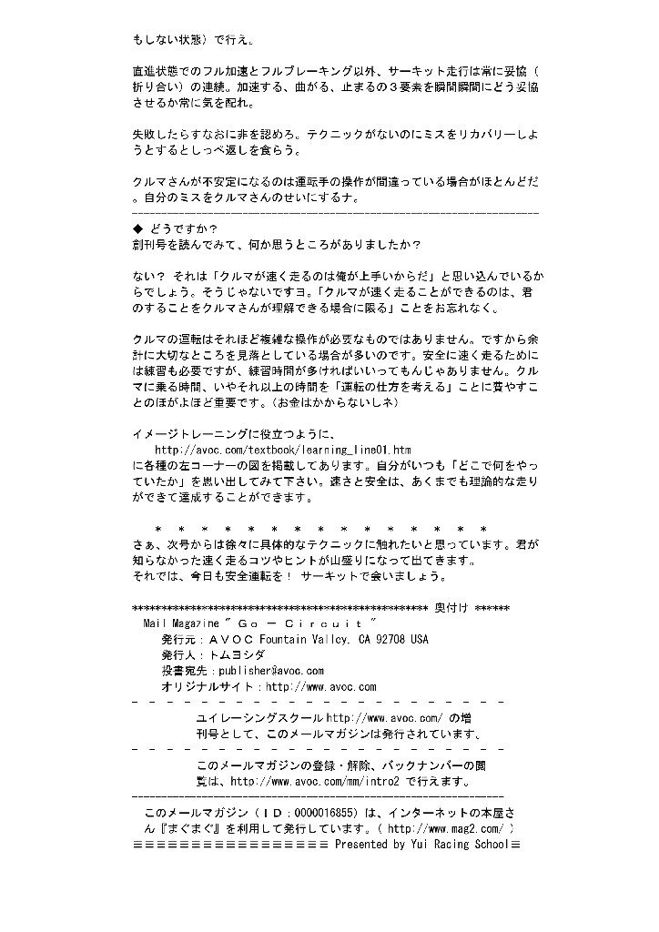 最近トム ヨシダのブログをユイレーシングスクールに転移するにあたり資料を調べていると、1999年9月1日に発行したユイレーシングスクールのメールマガジン、”Go Circuit”の創刊第1号のデータが出てきました。