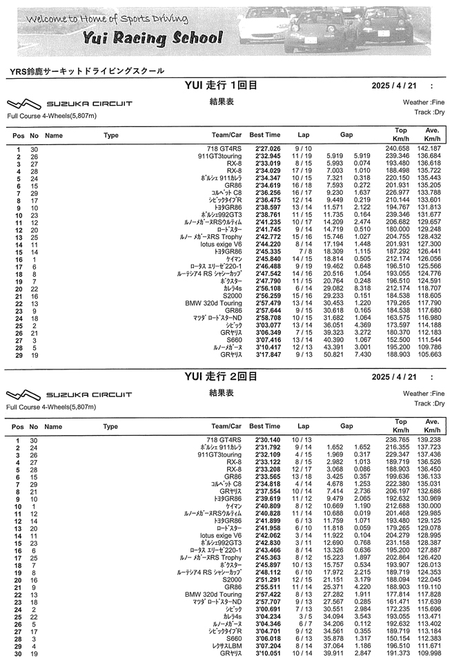 有数の高速コースを走るのでYRS鈴鹿サーキットドライビングスクールに限っては、過去にユイレーシングスクールのいずれかのプログラム、エンジンドライビングレッスンの他、YRSが主宰するポルシェクラブ東京銀座のドライビングレッスン、ルノー・スポールドライビングレッスン、アルピーヌドライビングレッスンを受講された方を対象に開催いたします。